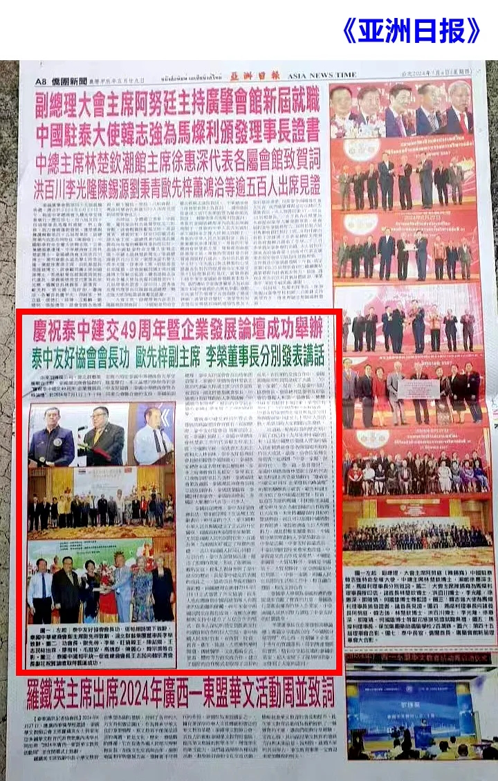 泰國中華總商會林楚欽主席的代表歐先梓副主席登臺致辭向"慶祝泰中建交49周年企業(yè)發(fā)展高峰論壇"的順利舉辦表示祝賀。歐先梓副主席介紹了泰中兩國在經(jīng)貿(mào)、投資、旅游等方面的現(xiàn)關(guān),同時指出兩國建交49年來在各個領(lǐng)域的合作取得巨大成效,未來將繼續(xù)保持良好的發(fā)展勢頭。而且可以預期中國將對世界經(jīng)濟、東盟經(jīng)濟產(chǎn)生巨大的推動力。湖北群藝集團董事長、中國積分制管理創(chuàng)始人李榮致辭表示:中泰是近鄰,中泰友好源遠流長,中泰民間經(jīng)貿(mào)往來愈來愈茂盛,中泰投資交流合作成果斐然,中國是泰國第一大貿(mào)易伙伴,泰國是中國第十三大貿(mào)易伙伴,在亞洲國家中位列第三。中泰一家親,兩國人民在長期的生活和工作中,相互融合發(fā)展,相互支持合作。泰國華人華僑為泰國經(jīng)濟的發(fā)展進步貢獻了寶貴的力量,泰國各行業(yè)都有優(yōu)秀的華人企業(yè)家,中泰兩國人民共同努力譜寫了中泰友好的壯麗篇章。