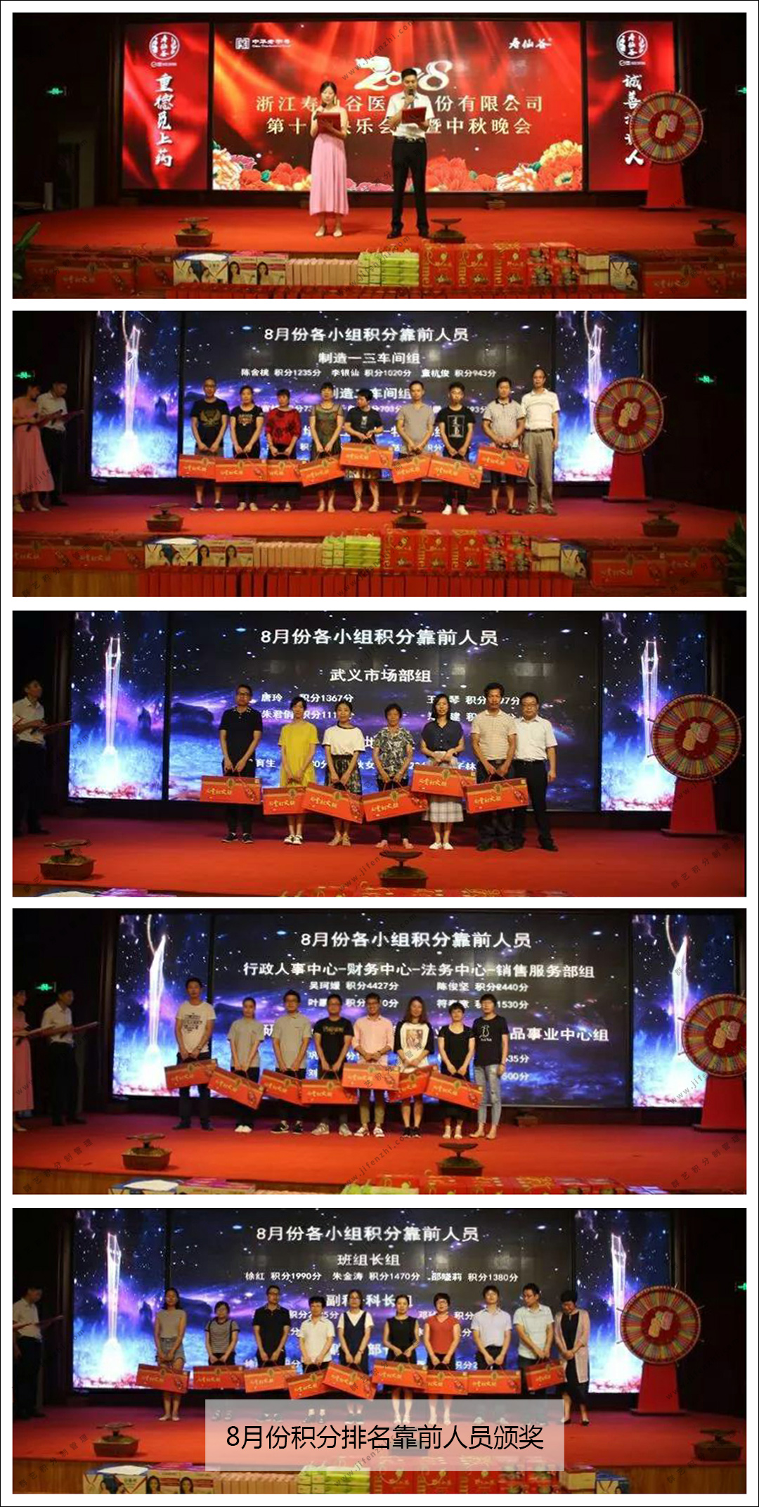 2018年9月,浙江壽仙谷醫(yī)藥股份有限公司第十次快樂會(huì)議暨中秋晚會(huì)正式開始!本次積分靠前的獎(jiǎng)勵(lì)是中秋大禮包!8月積分靠前的人員有:制造一三車間組、制造二車間組、組培部-工程部-物控部組、武義市場部組、基地部組、行政人事中心-財(cái)務(wù)中心-法務(wù)中心-銷售服務(wù)部組、藥品事業(yè)中心-營養(yǎng)與美容事業(yè)中心-研發(fā)質(zhì)保中心組、班組長組、副科-科長組、副部-部長組。